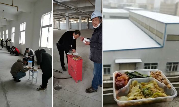 董事長(zhǎng)徐濤、各位項(xiàng)目經(jīng)理與全體施工人員因陋就簡(jiǎn)的用餐