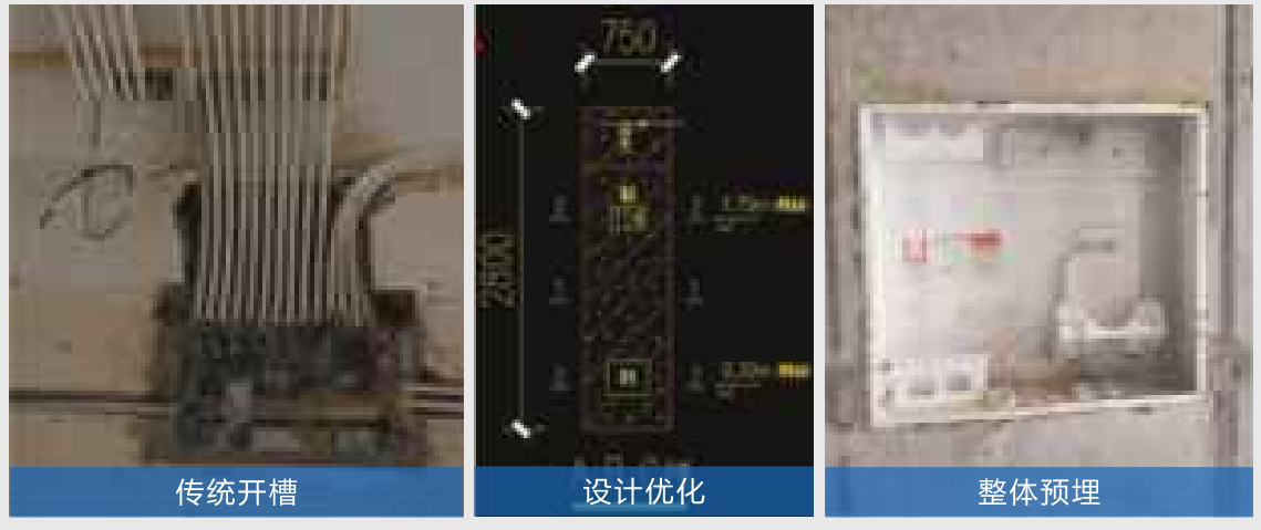 強弱電箱原圖紙在砌體上開槽后埋線盒子,再進行用砂漿修補,這樣在工人施工過程中容易鑿斷或者震裂砌墻,后期修補因砂漿過厚也會引起面層開裂。為確保質量,經(jīng)過設計優(yōu)化,增加構造柱預埋線管及電箱,這樣不但解決開裂問題,加快了施工進度,大大消除了質量風險。